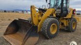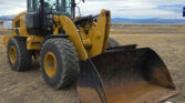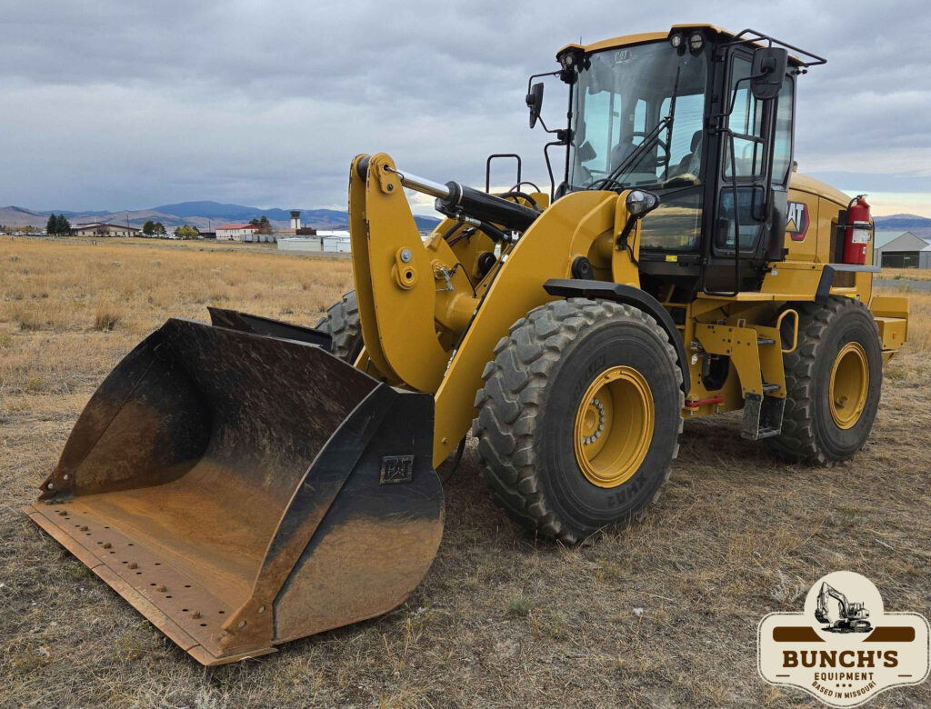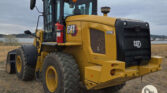 The 2023 Caterpillar 930M wheel loader has 501 hours and is powered by a 7.01L Caterpillar C7.1 diesel engine with a Powershift transmission (4F-4R). It features an enclosed cab with AC and heat, joystick bucket controls, and ride control. The loader includes front auxiliary hydraulics, a hydraulic quick coupler, and a 3 cu.yd. Caterpillar self-leveling bucket with a bolt-on cutting edge. It is equipped with 20.5R25 tires and a limited slip differential.