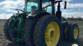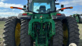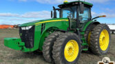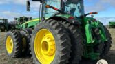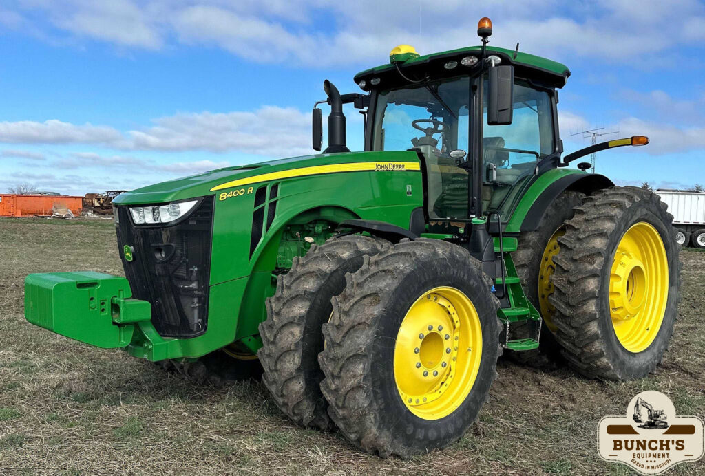 The 2018 John Deere 8400R MFWD tractor has 1,702 hours and is powered by a 9.0L John Deere diesel engine, delivering 400 HP with a Powershift transmission (23F-11R). It features an enclosed cab with AC, heat, and a John Deere display, along with auto steer. The tractor is equipped with a 1 3/4" 1000 PTO, three-point hitch with quick attach, ISOBUS outlet, hydraulic remotes, and suitcase weights. It has front duals, rear duals, and a wheelbase of 120",…