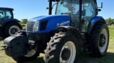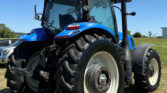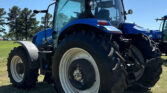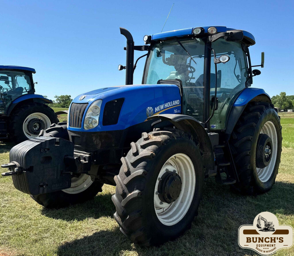 The 2014 New Holland T6.175 MFWD tractor has 891 hours and is powered by a six-cylinder diesel engine with a Powershift transmission (16F-16R) and a left-hand reverser. It features differential lock, AC, heat, and a light bar. The tractor is equipped with a New Holland FM-750 display, auto steer, a 1000 PTO, a three-point hitch, seven-pin outlet, and four hydraulic remote sets. It includes 10 suitcase weights and has 14.9-30 front tires and 18.4-42 rear tires, with 6 wheel weights.